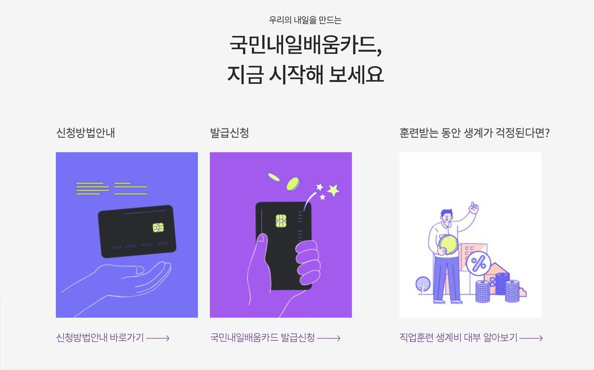 취업 준비를 하고 있거나, 새로운 분야를 배워보고 싶은 마음이 생겼나요? 취업, 이직, 역량 개발에 필요한 다양한 교육을 카드 한 장으로 지원 받을 수 있는 ‘내일배움카드’를 발급해보세요! 오늘은 이 카드를 신청할 수 있는 조건과 발급 방법, 사용처 확인 방법 등 필요한 정보를 정리해드리겠습니다.