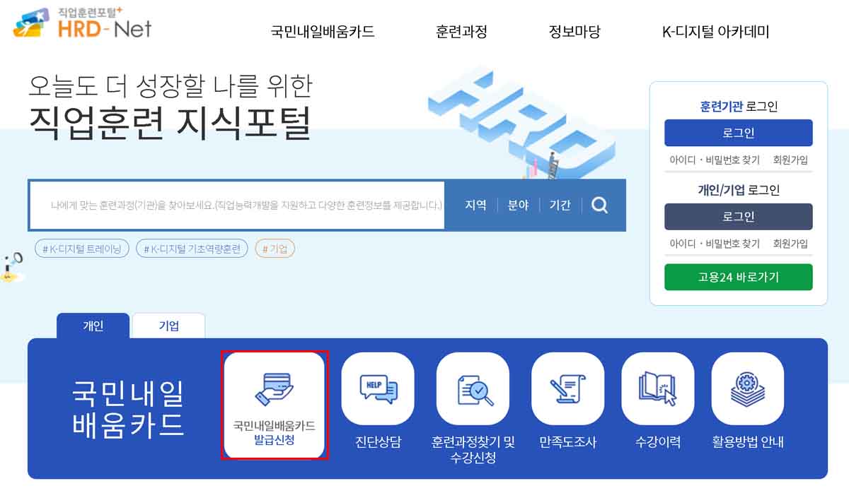 [고용24] 홈페이지 ➡️ 회원가입/로그인 ➡️ 전체 메뉴 ➡️ 직업 능력 개발 ➡️ 국민내일배움카드 발급 신청 ➡️ 카드 수령 후 훈련비 결제