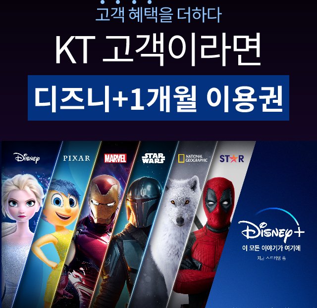 너무 유명해서 그런지, 디즈니플러스는 무료 체험이나 할인 이벤트를 제공하지 않아요. 다만, KT 이용객이라면 12월 말까지 디즈니플러스 무료 체험 프로모션을 신청할 수 있습니다.