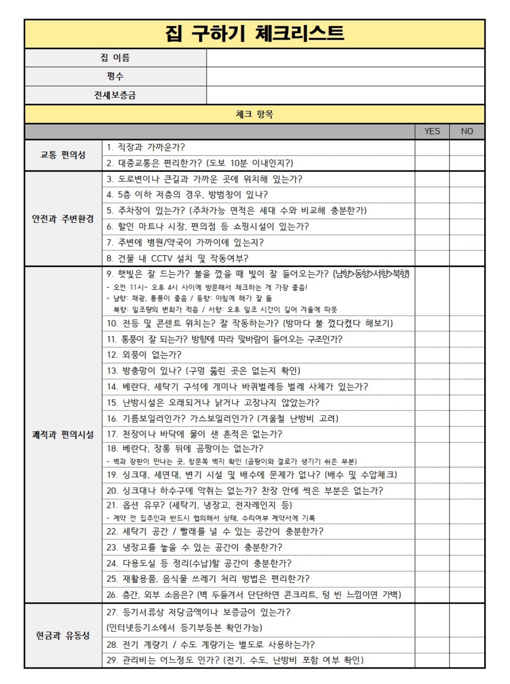 집 구하기, 원룸 체크리스트
