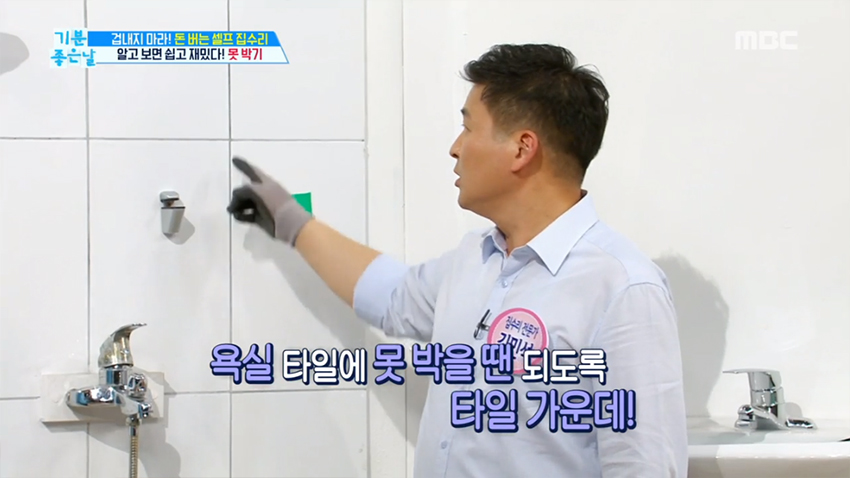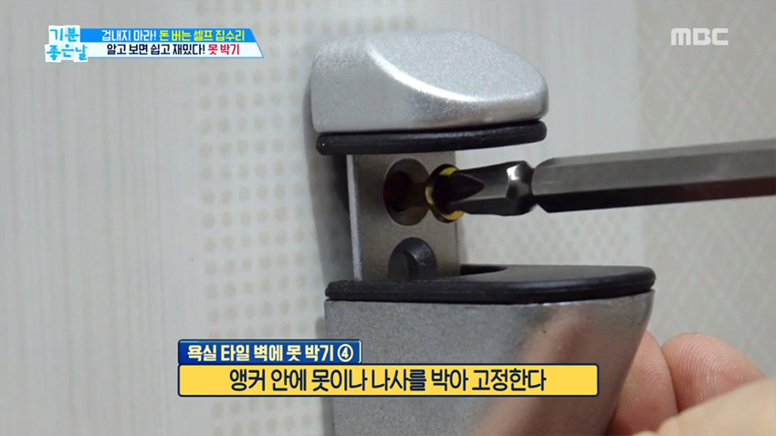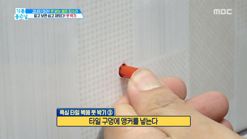 단! 수도꼭지와 수직, 수평 공간은 반드시 피해라. 박다가.. 수도관과 까꿍~ 할 수도 있다. 구멍을 냈다면 타일 구멍에 앵커를 넣고, 앵커 안에 못이나 나사를 박아 고정하면 된다.