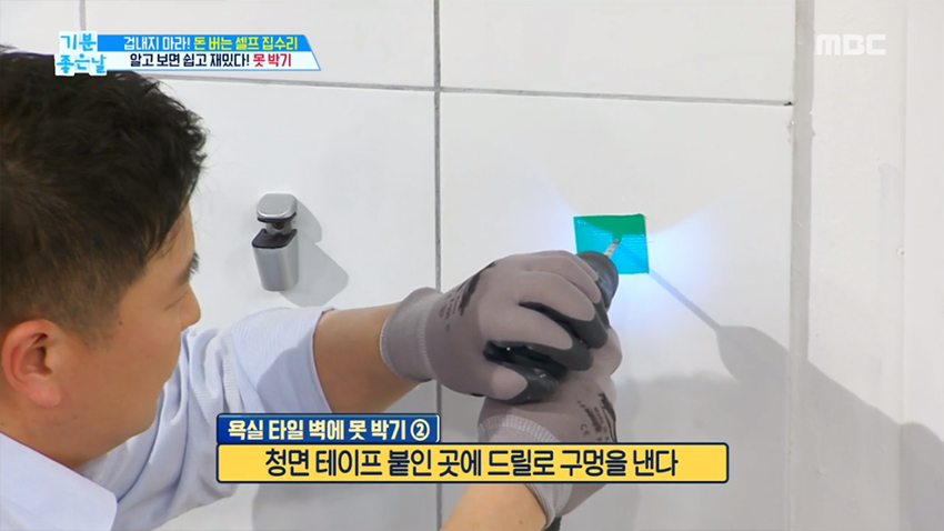 타일 벽은 일반 망치를 쓸 수 없다. 박는 순간 다 깨진다. 이럴 때 필요한 건 전동 드릴. 욕실에 선반을 두고 싶거나 휴지걸이를 달고 싶은 애기들은 잘 봐라. 전동드릴로 무조건 뚫는 것이 아니라 청테이프로 뚫을 위치를 먼저 정해야 한다.
