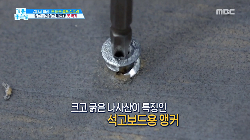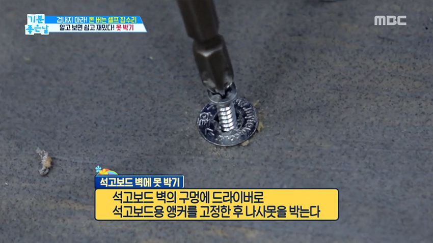 석고보드 벽은 나사못을 지지할 힘이 없다. 그래서 일반 나사못은 쉽게 빠져버린다. 이럴 때 필요한 건 바로 석고보드용 앵커. 앵커가 뭐냐고 묻지 않아도 철물점 가면 아저씨가 알아서 주신다. 벽의 구멍에 드라이버로 앵커를 고정한 후 나사못을 박아준다. 이 앵커의 경우는 크고 굵은 나사산이 특징이기 때문에 벽의 구멍 내는 데 도움을 준다.