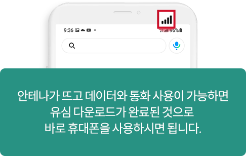 유심 미리 안 꽂고 잘 기다리셨죠? 이제 셀프 개통이 완료됐다면 휴대폰에 유심을 끼우고 전원을 2~3회 정도 껐다 켰다 반복해 주세요. 유심 인식이 되지 않을 경우 수동 유심 다운로드를 진행하면 됩니다. 위 이미지처럼 안테나가 뜨고 데이터와 통화 사용이 가능하면 유심 다운로드가 완료된 것으로 바로 휴대폰을 사용하시면 돼요!