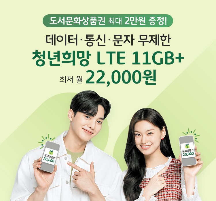 아니 글쎄 청년희망적금에 가입한 청년이라면 월 22,000원으로 같은 요금제를 이용할 수 있다는 것 아니겠어요? 국민은행 청년희망적금에 가입한 사람에 한해 같은 요금제를 6월 30일까지 할인하고 있습니다!