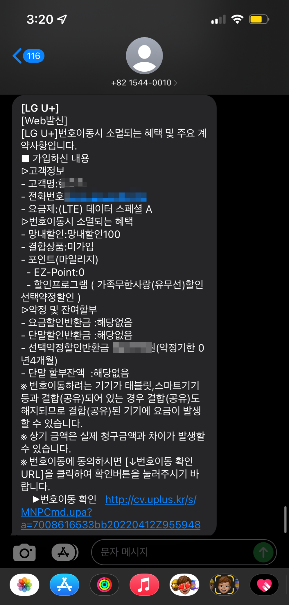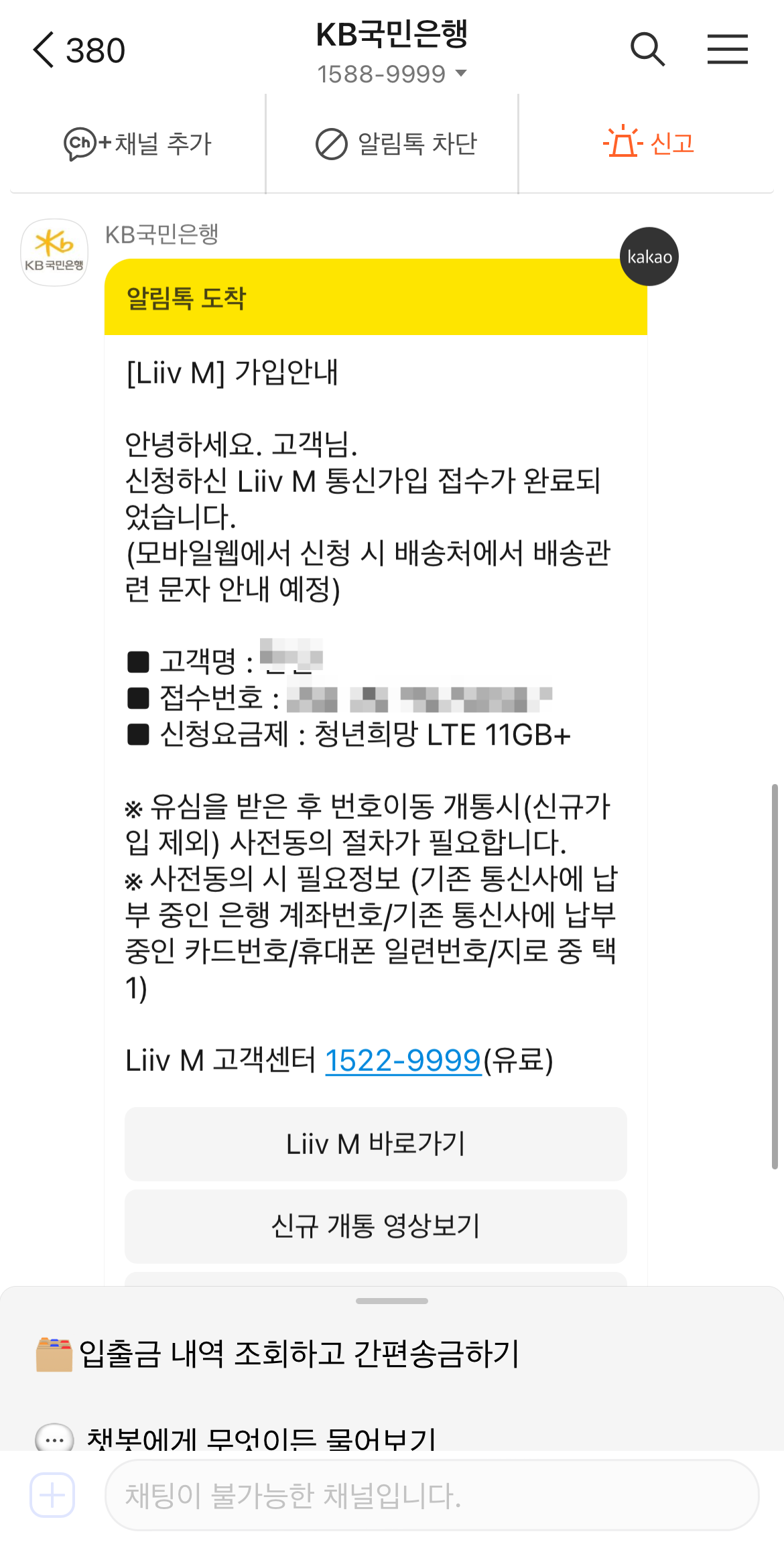 가입을 완료하고 나면 이렇게 두 개의 문자 메시지 혹은 카카오톡 메시지가 옵니다. 우선 기존 통신사에서 온 번호이동 확인 문자 메시지의 링크를 통해 번호이동 확인을 진행해 주세요. 이후 국민은행에서 온 메시지의 Liiv M 바로가기를 클릭, 개통을 진행하면 됩니다.