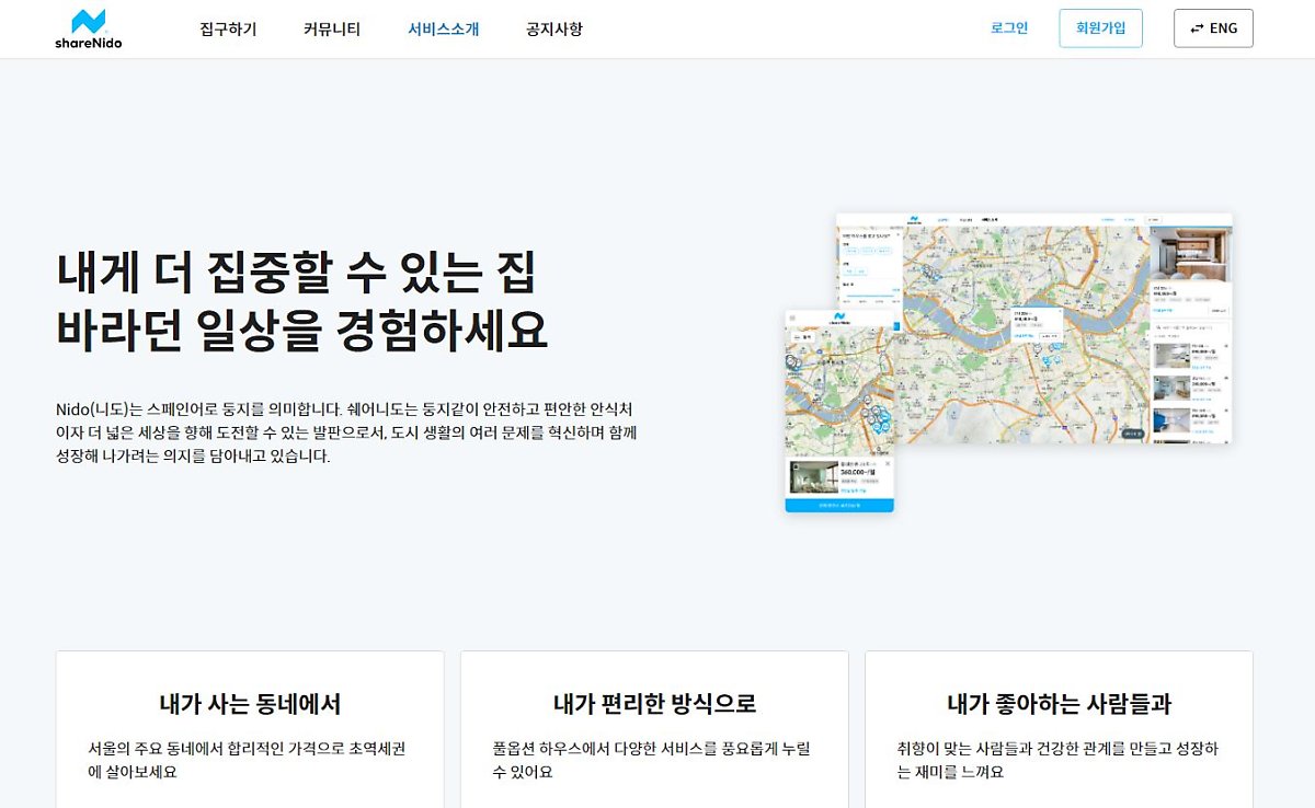 스페인어로 둥지를 의미하는 니도. 쉐어니도는 강남, 서대문, 용산, 마포, 성동에 여러 개의 하우스를 두고 있으며 다양한 소셜클럽을 개설하고 참여할 수 있어 매력적인데요. 홈페이지에서 입주 희망 지역과 희망 월세를 검색하면 이에 해당하는 하우스의 자세한 이미지와 정보를 확인할 수 있습니다.