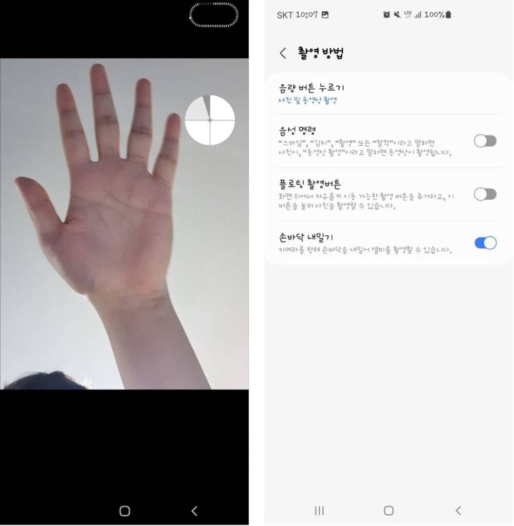 세 번째는 완벽한 셀카를 찍기 위해 고군분투하는 사람들에게 필수적인 기능입니다. 셀카를 찍을 때는 한 손으로 셔터 버튼을 눌러야 하기 때문에 핸드폰을 떨어뜨리거나 화면이 흔들리는 경우가 많아요. 하지만 손바닥 내밀기 기능을 활용하면 훨씬 쉽게 셀카를 찍을 수 있습니다.