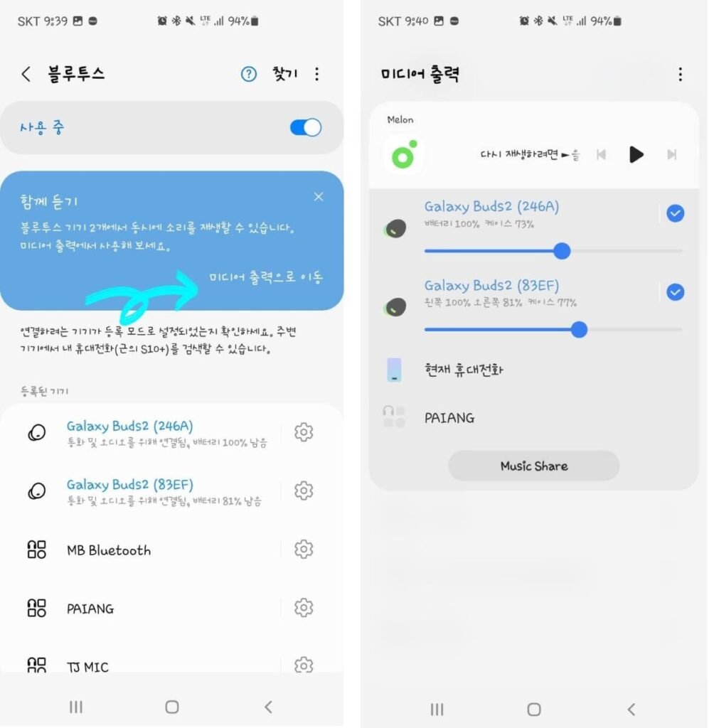 연결이 됐다면 블루투스 찾기 버튼을 눌러 두 번째 이어폰을 연결해요. 그러면 왼쪽 화면처럼 두 개의 이어폰이 모두 연결되고 함께 듣기라는 알림이 뜹니다.