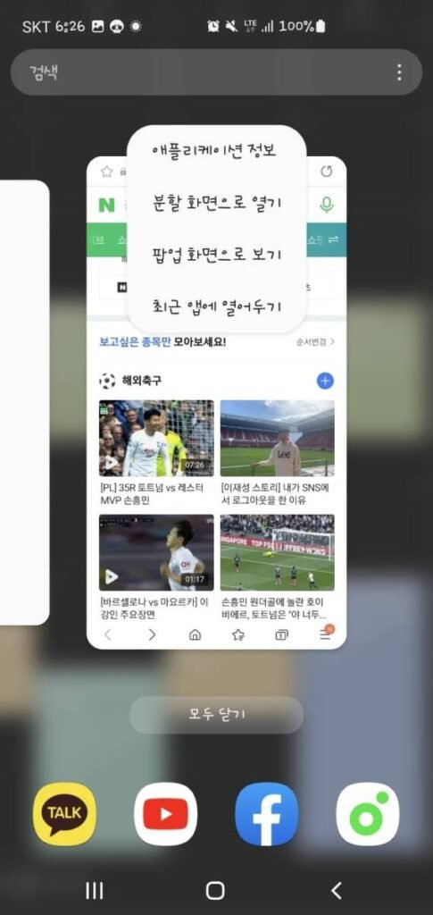 상단의 아이콘을 길게 눌러주면 분할 화면으로 열기, 팝업 화면으로 보기 등의 메뉴들을 볼 수 있는데 이 메뉴들을 통해 멀티태스킹 기능을 활용할 수 있습니다.
