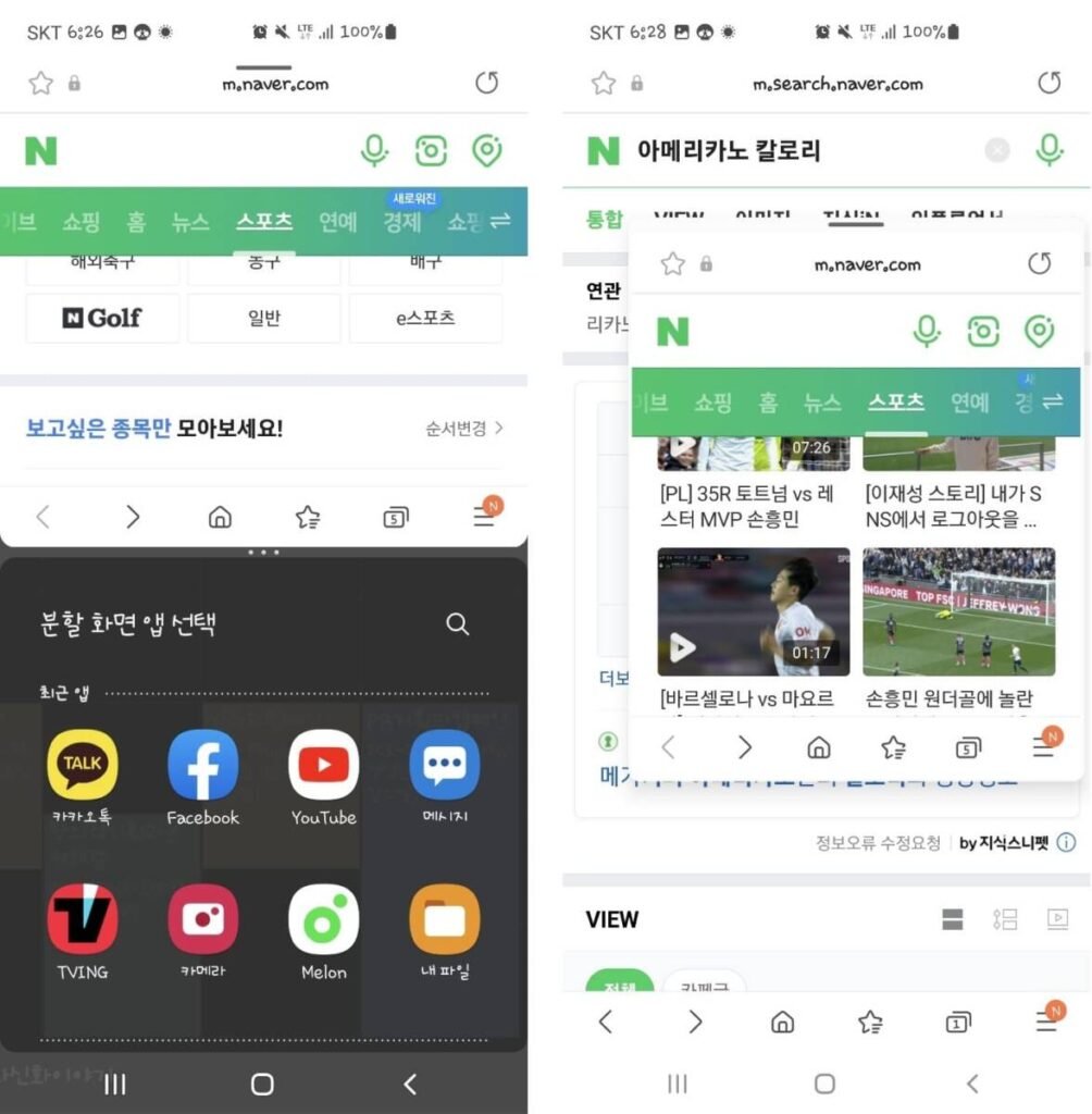 예를 들어서 분할 화면으로 열기를 선택하면 왼쪽처럼 두 개의 앱을 동시에 실행할 수 있고, 팝업 화면으로 보기를 선택하면 오른쪽처럼 앱 위에 작은 팝업 화면으로 다른 앱을 실행할 수 있어요.