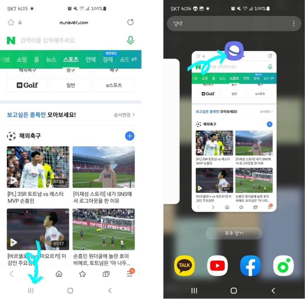먼저 가장 하단 메뉴 왼쪽의 실행 중인 앱 보기 아이콘을 눌러주세요. 그러면 전에 실행했던 앱들이 순서대로 화면에 나열됩니다. 그리고 화살표로 표시된 상단 아이콘을 길게 눌러주세요.