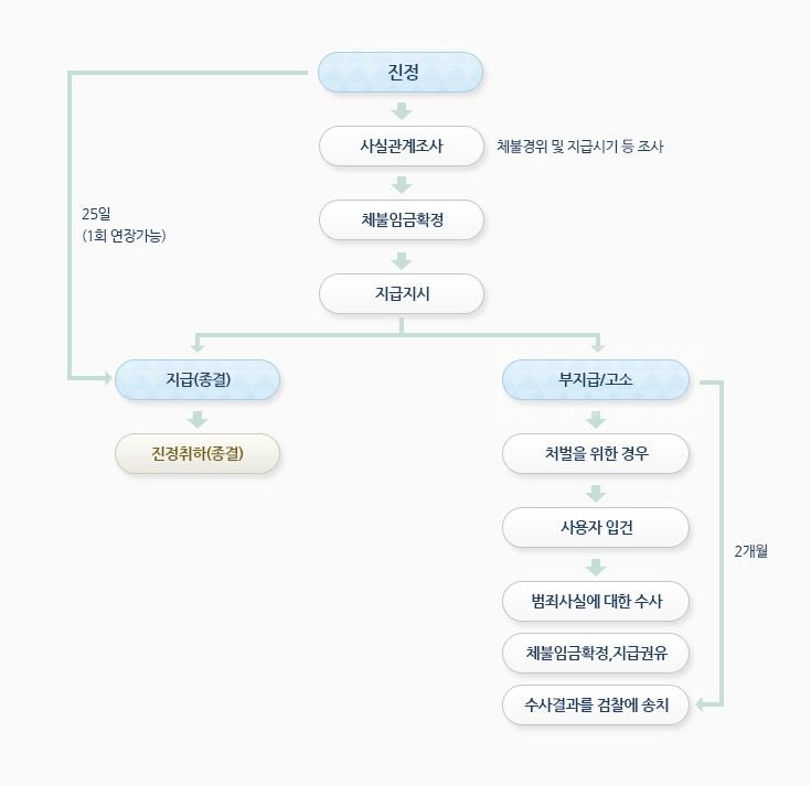 진정하게 되면 사실관계조사 (체불경위 및 지급시기 등 조사), 체불임금확정, 지급지시 등의 절차를 거치게 됩니다. 만약 지급이 되지 않는다면 고소로 진행되고 처벌을 원한다면 사용자 입건-범죄사실에 대한 수사-체불임금확정 및 지급 권유-수사 결과 검찰 송치 등의 절차가 2개월간 진행됩니다.
