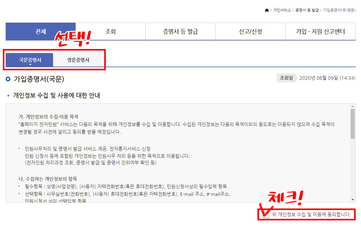 로그인 완료 후에는 국문/영문증명서를 선택하고 정보 수집에 동의합니다.