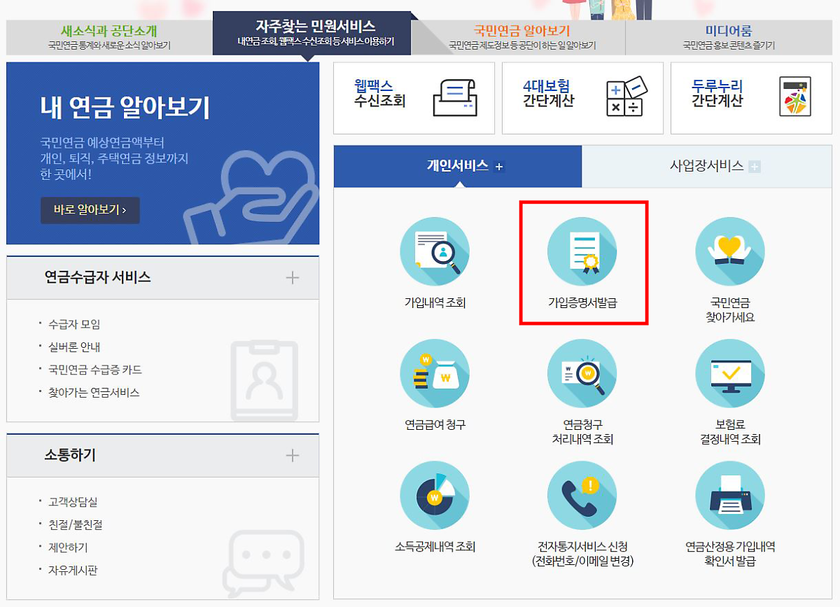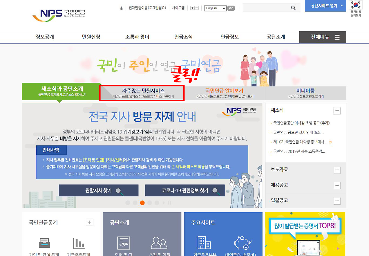 국민연금 홈페이지에서 자주찾는 민원서비스를 클릭하세요.