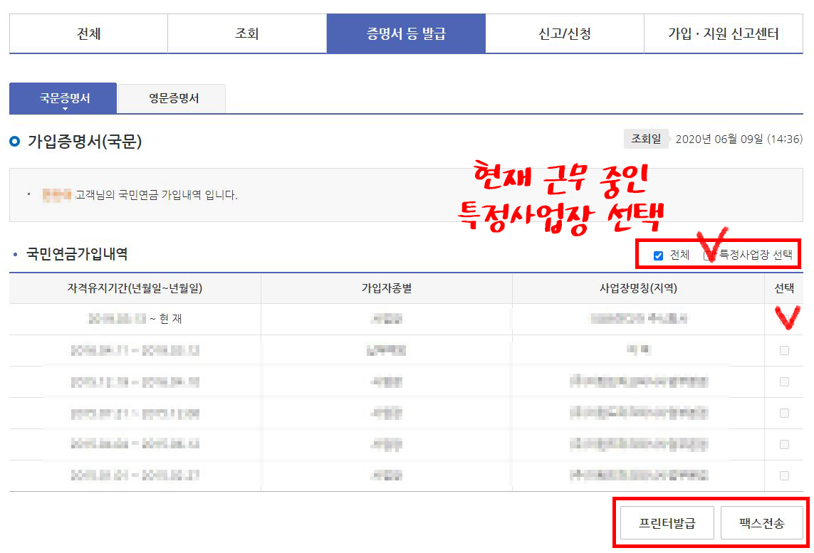 확인하고 나면 국민연금가입내역이 나오는데요. 현재 재직하고 있는 회사의 재직증명서가 필요한 것이니 특정 사업장 선택을 체크하고 해당 사업장을 선택하세요. 이후 프린터발급 또는 팩스전송을 누르면 완료!