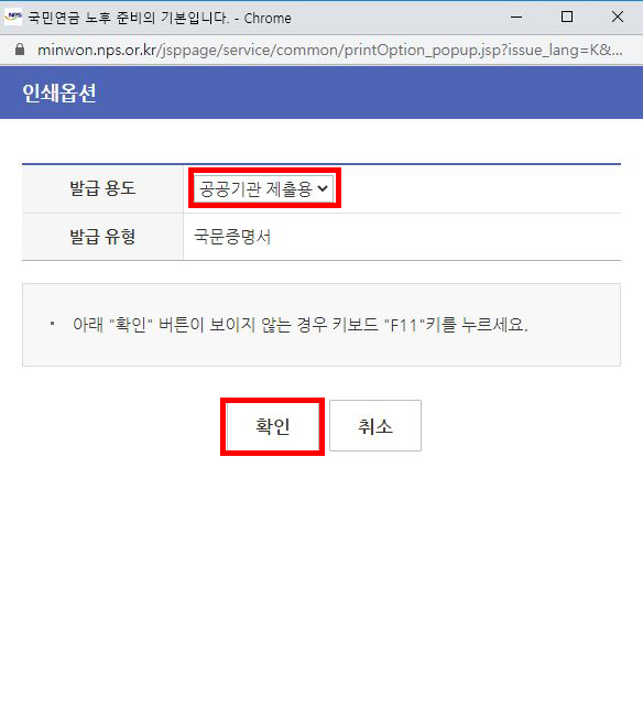 저는 프린터발급을 선택했는데요. 개인, 공공기관, 금융기관 등의 발급 용도에 맞게 체크하세요.