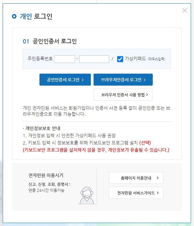 개인서비스의 가입증명서발급을 선택!