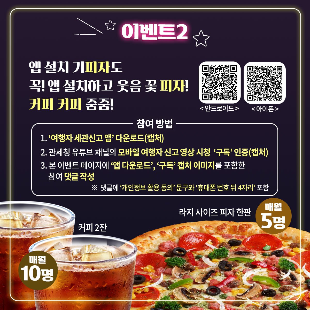 그리고 SNS를 통한 앱 설치 인증 이벤트도 진행하며, 커피와 피자를 받을 수 있으니 해외여행을 계획하고 있는 분들이라면 이벤트에 참여하고 경품도 받아 가시기 바랍니다.