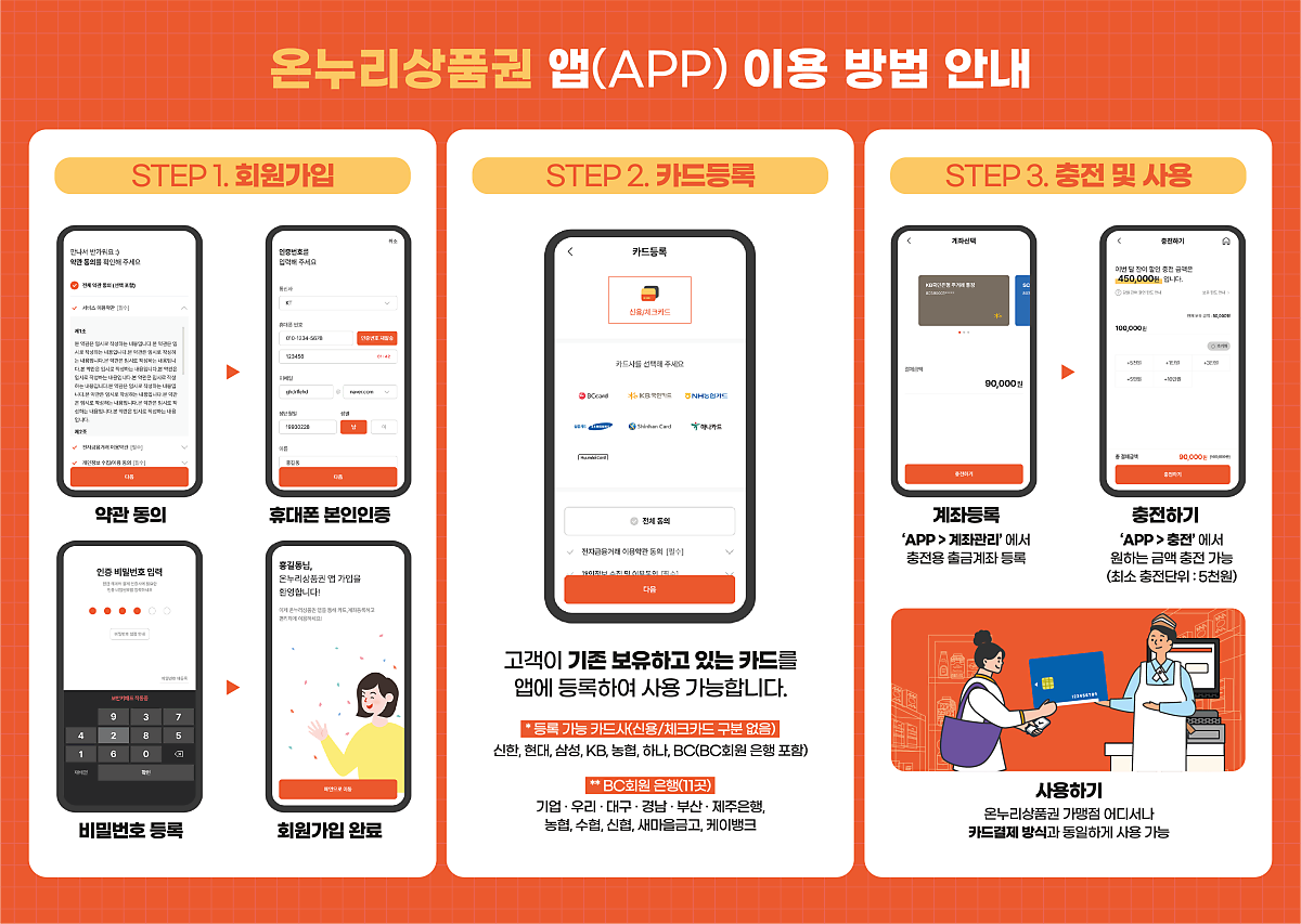 온누리상품권은 앱을 통해 편리하게 온누리상품권을 충전하고 등록한 카드를 통해 결제할 수 있는 서비스입니다. - 일반 사용자 : 앱을 통한 온누리상품권 금액을 충전하고, 본인 명의의 카드
