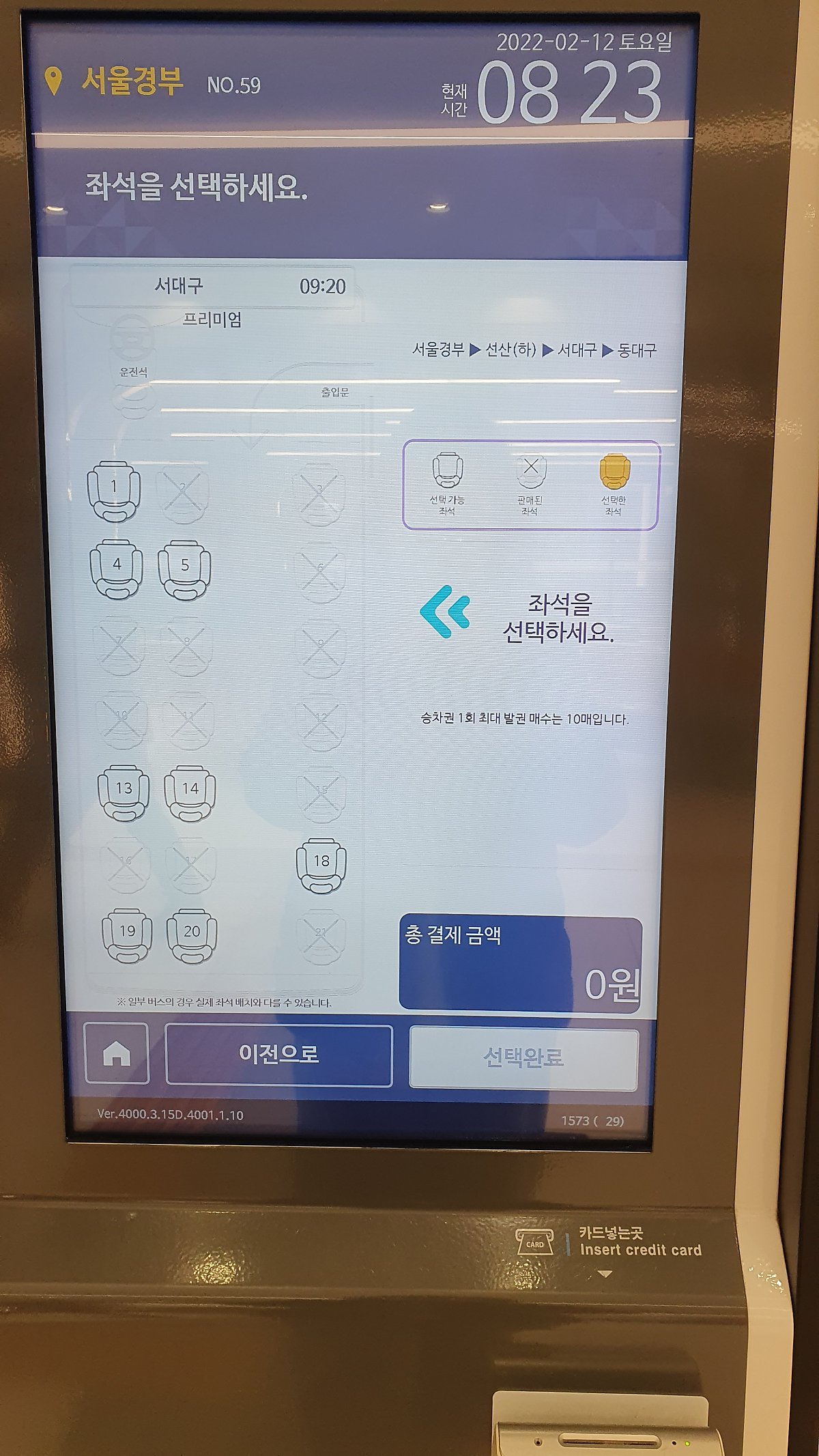 물론!!! 어플에서 미리 예매를 못했어도 버스 터미널에서 티켓을 구매할 수 있습니다. 어플과 똑같이 시간과 출발지를 선택한 후, 배차 정보가 나오면 버스 등급을 확인하고 자리를 선택하면 돼요. 저는 버스 출발 1시간 전에 갔는데 자리가 많이 빠졌더라구요. 프리미엄 버스 좌석은 21~22개밖에 없어서 다른 버스보다 예매를 빨리 해야하니 참고해주세요.