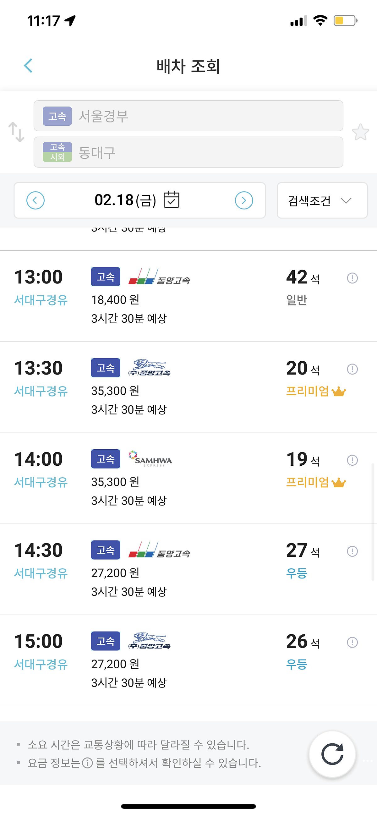 티머니고 어플을 깔고, 출발지와 도착지를 선택 한 후, 시간대 별로 나와있는 버스 배차 시간표에서 일반/ 우등/ 프리미엄을 보고 선택하면 돼요. 도착 시간은 다 똑같지만 가격이 만원 좀 안되게 차이가 나네요.