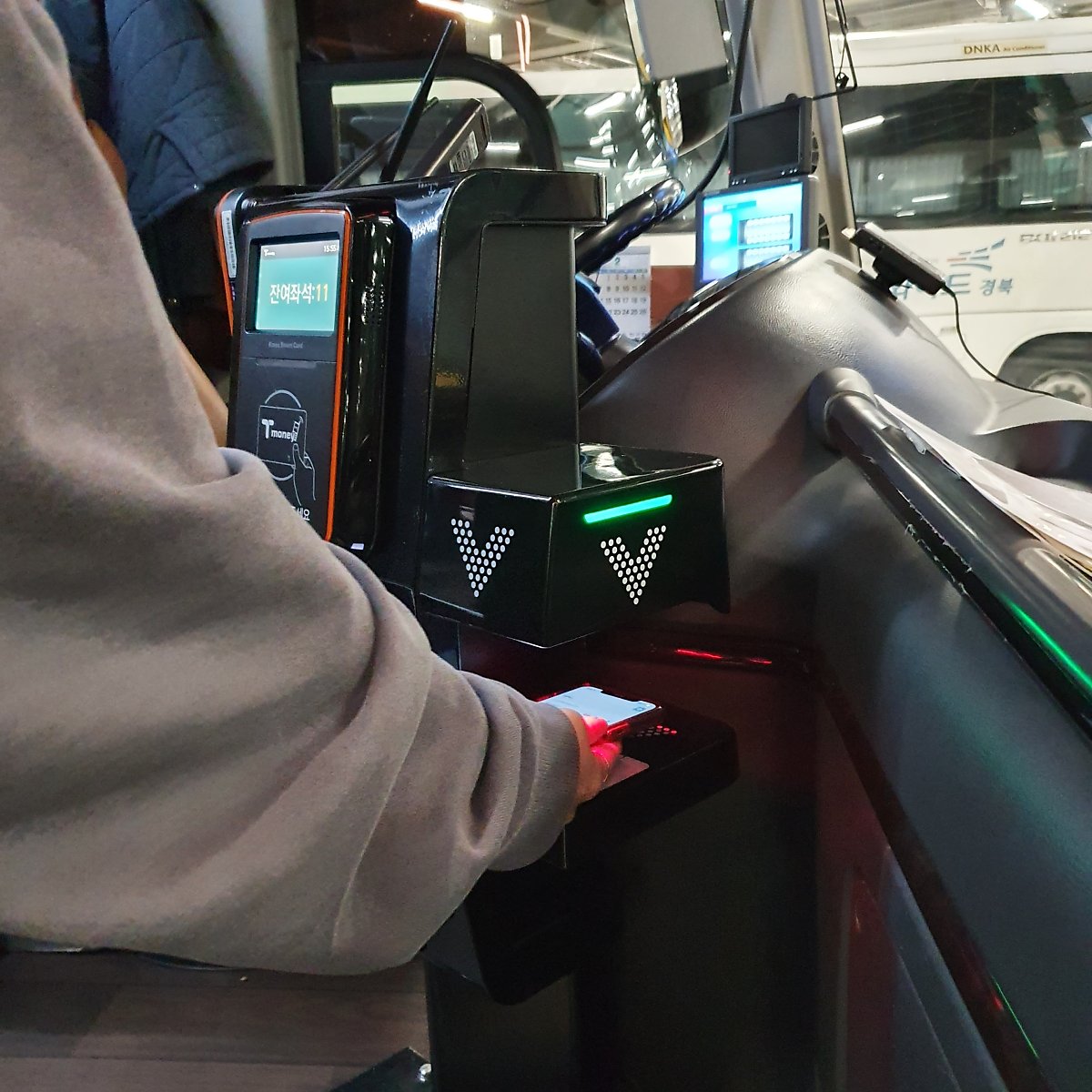 요즘은 기사님이 하나 하나 티켓 검사 안하고 모바일 티켓 QR찍고 알아서 들어가는 거 다 아시죠? 미리 화면에 QR코드를 띄워놓고 화살표 V아랫쪽 빨간 불빛이 나오는 곳에 핸드폰을 갖다 대면 알아서 승차 처리가 되고 좌석 번호도 알려준답니다. (세상 참 조아졌,,,)