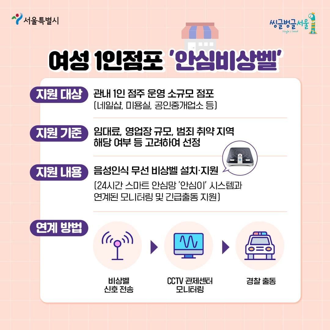 1인 가구의 여성에게는 '스마트 초인종', '가정용 폐쇄회로 CCTV' 와 1인 여성 점포에는 경찰이 바로 출동 할 수 있는 '안심 비상벨'을 지원해요.