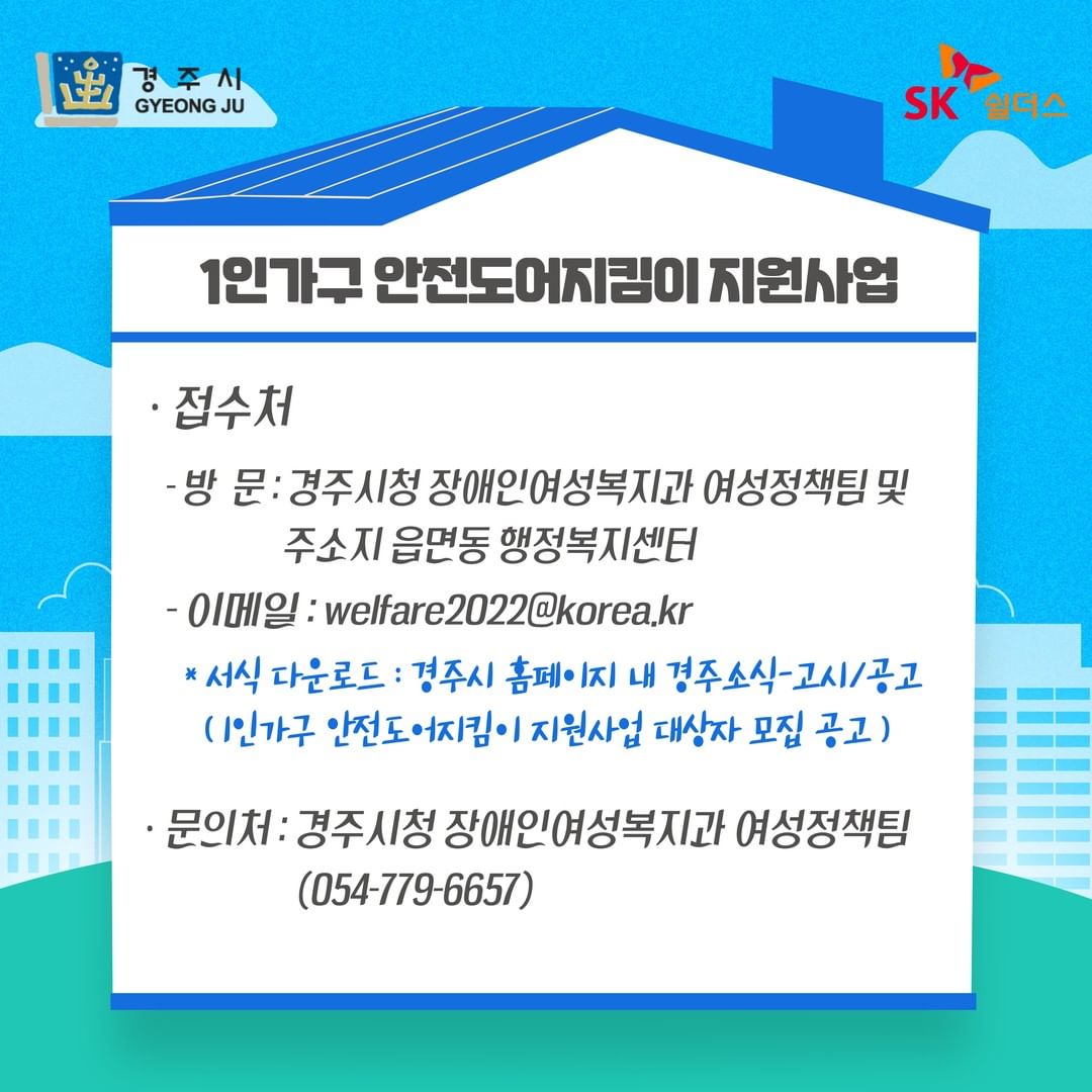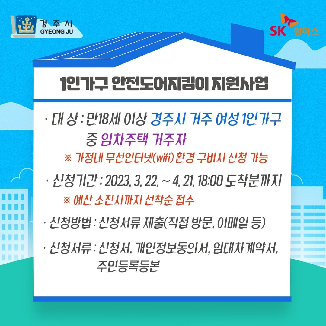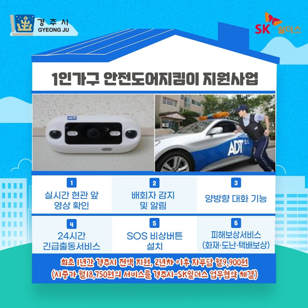 경주시도 1인 가구 여성의 주거 안전을 위해 ‘안전도어 지킴이 지원 사업’을 추진 한다고 합니다! 무료는 아니지만, 전문 보안 업체의 가정용 보안 서비스를 저렴한 가격으로 이용할 수 있어요.