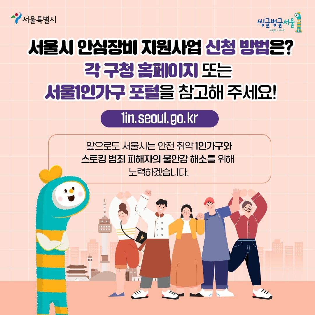 그리고, 여성 뿐만 아니라 1인 가구에게도 안심 홈세트를 지원한다고 하는데요. 원래는 소액 임차 1인 가구에만 지원했지만 올해부터는 모든 1인 가구 대상으로 확대되었다고 하니 너무 반가운 소식이죠? (단, 세부 지원은 지역, 주거 형태, 소득 등을 고려해 자치구 별로 기준을 마련해서 시행한다고 하니 참고해 주세요!)