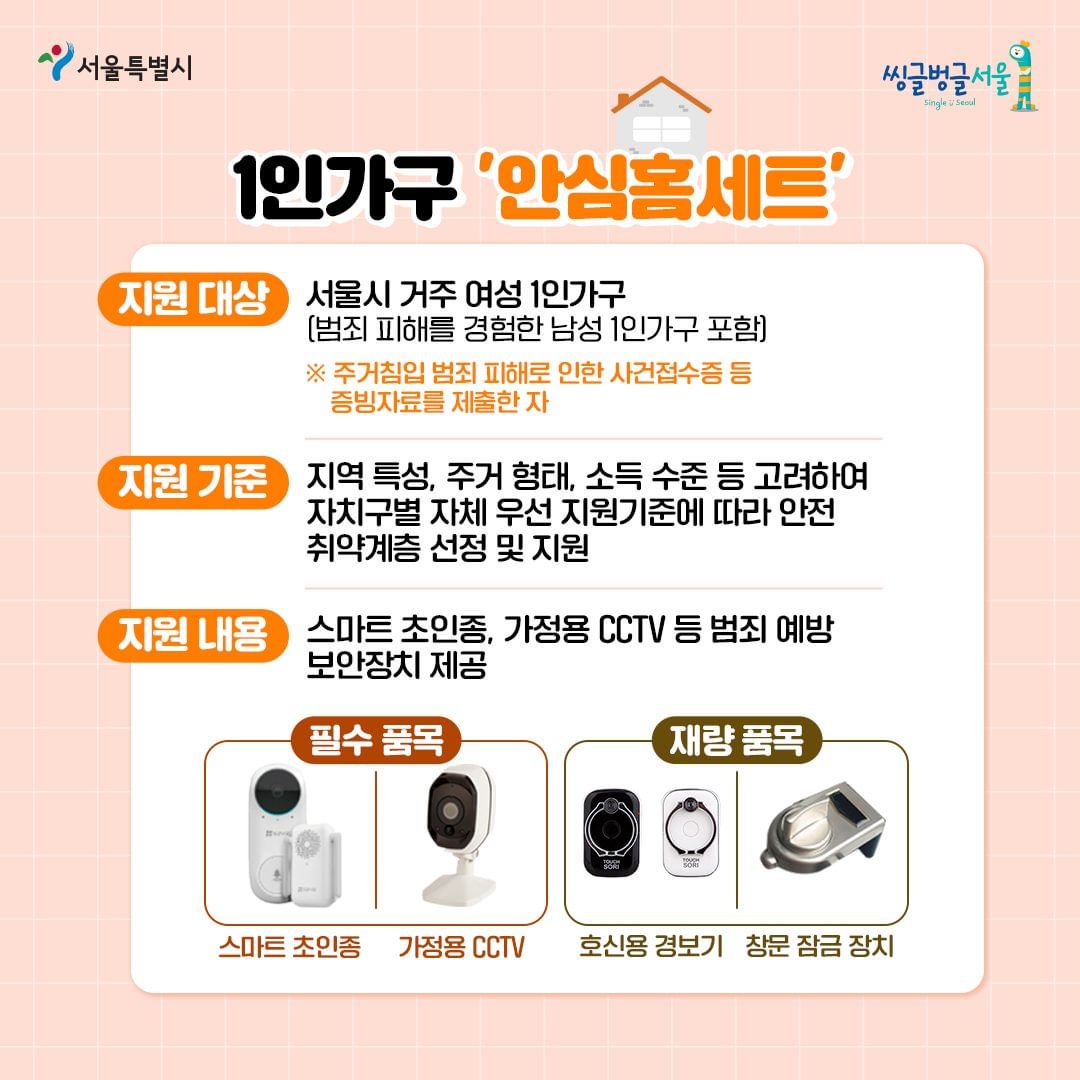 1인 가구 여성은 ‘스마트 초인종’ , ‘가정용 CCTV’ 두 개와 자치구별로 필수 2종을 추가로 제공 받을 수 있어요. 또한 여성 1인 점포에는 ‘음성 인식 비상벨’을 지원하고 있습니다. (여성 1인 점포의 경우, 지연 없이 바로 잠김 기능이 있는 ‘디지털 도어록’ 추가 지원)