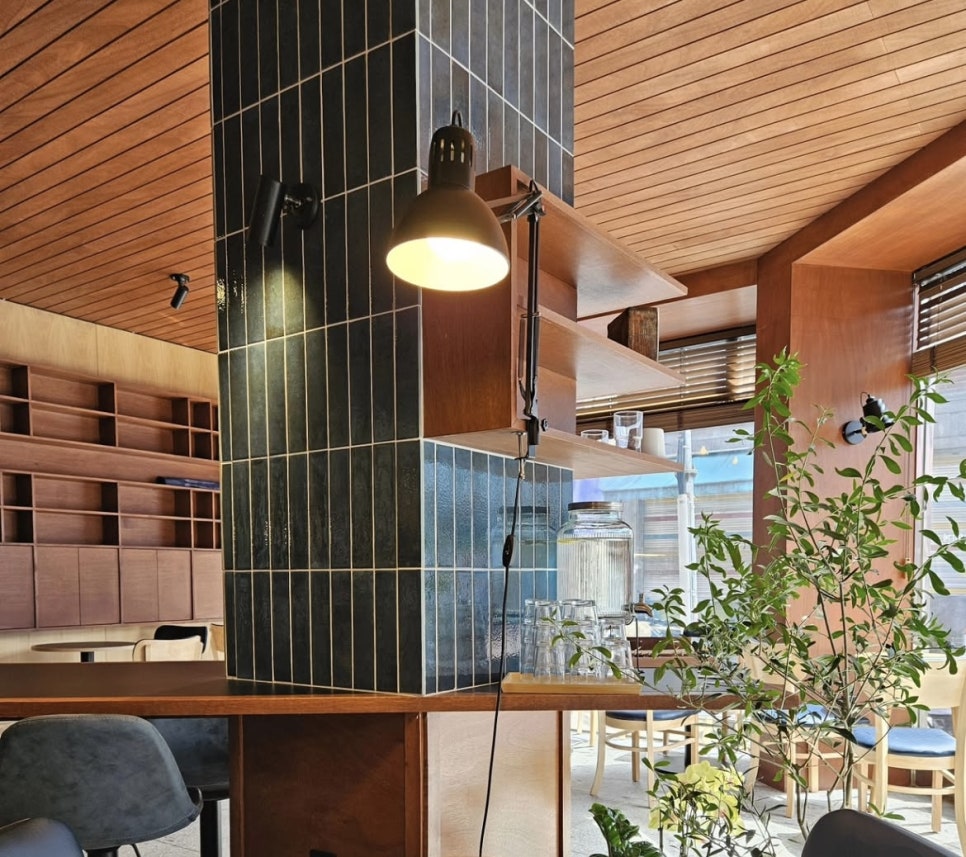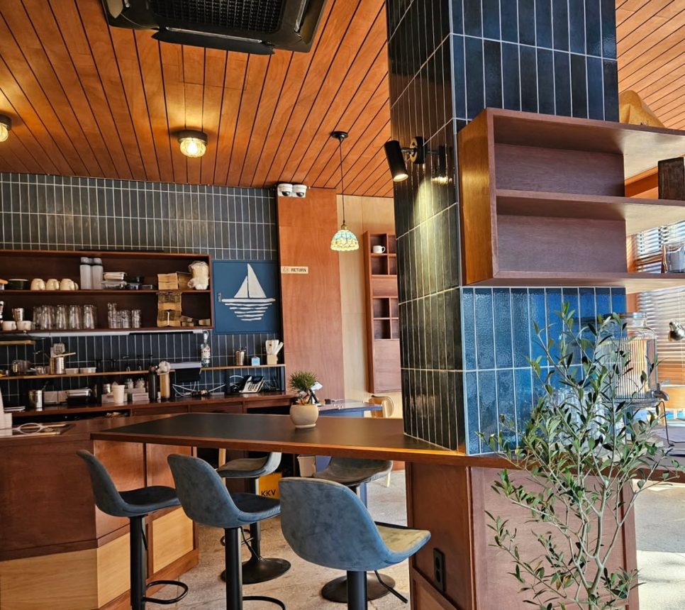 푸른 바다를 연상케 하는 짙은 파란색 타일과 나무배와 같은 우드 색감으로 꾸며져 있는 카페 레펜!